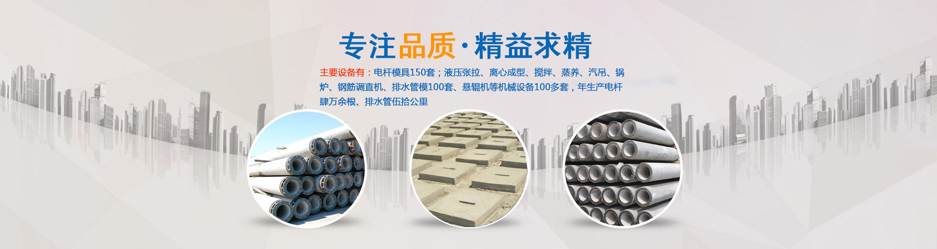 公司主要生產(chǎn)ф100—ф430環(huán)形預(yù)應(yīng)力混凝土電桿和ф190—ф550環(huán)形鋼筋混凝土電桿,以及ф300—ф1000排水管,主要設(shè)備有:電桿模具180套;液壓張拉、離心成型、攪拌、蒸養(yǎng)、汽吊、鍋爐、鋼筋調(diào)直機、滾焊機、排水管模100套、懸輥機等機械設(shè)備100多套,年生產(chǎn)電桿肆萬余根、排水管伍拾公里。……